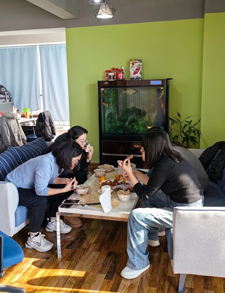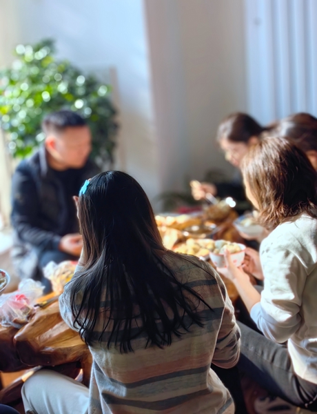 人多力量大,很快饺子皮用完了。馅儿也没了。到了看水饺赢餐具的时候啦、会员们都夸着自己的爱心便当--水饺。争夺奖品。发完奖品大家坐在一起吃瓜子、聊天、唱歌、等着煮饺子。
